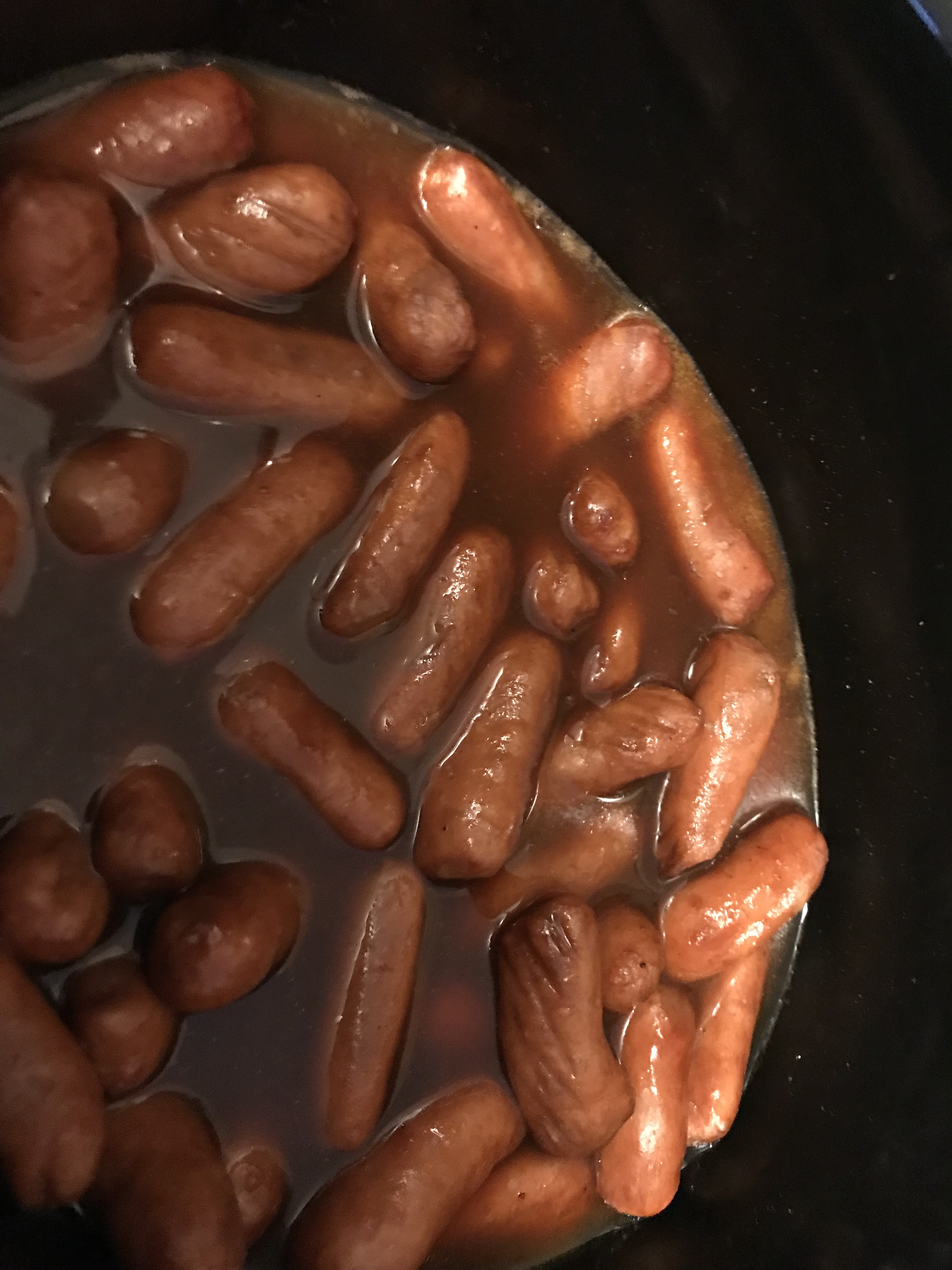 Heat a crock pot on high and add in the sausages and bbq sauce. Thin it out a bit with some water so it can reduce as it heats. Adjust the seasoning as needed.
